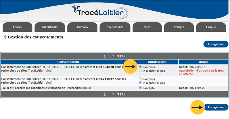 Lorsque vous avez activé votre compte TracéLaitier, vous avez sélectionné « J’autorise » ou « Je n’autorise pas ».