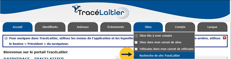 Pour trouver un no de site dans TracéLaitier, cliquez sur Sites puis sur Recherche de site TracéLaitier.