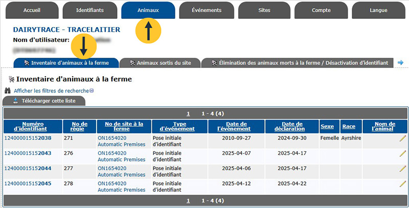 Pour voir l’inventaire du troupeau à jour de votre site, allez dans l’onglet Animaux en haut de la page, puis sélectionnez Inventaire d’animaux à la ferme. Vous pouvez également voir une liste des Animaux sortis du site ou des événements Élimination des animaux morts à la ferme / Désactivation d’identifiant.
