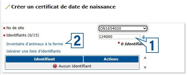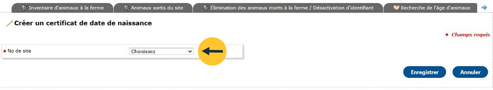Sélectionnez le numéro du site où l’animal ou les animaux sont actuellement logés.