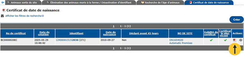 Cliquez sur l’icône PDF pour générer le certificat.