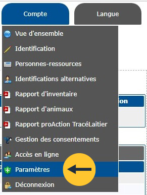 Connectez-vous au portail TracéLaitier, sélectionnez l’onglet Compte, puis Paramètres dans le menu déroulant.