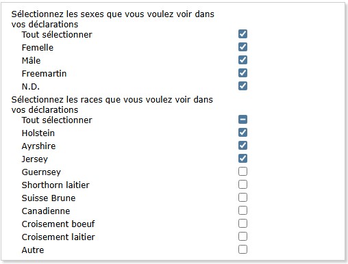 Dans la liste des races, sélectionnez uniquement celles que vous voulez voir apparaître dans vos options lors de la déclaration d’événements. Vous pouvez faire la même chose pour les sexes.