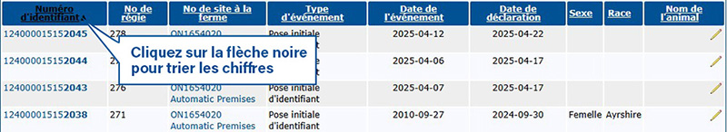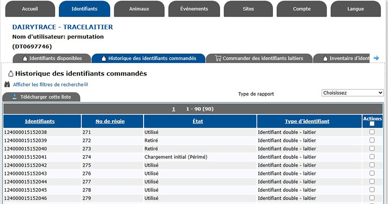 Sélectionnez Historique des identifiants commandés pour voir une liste de tous les identifiants enregistrés dans votre compte avec l’État et le Type d’identifiant (laitier ou boucherie). Pour savoir comment trier et filtrer cette liste, cliquez ici : [Dropdown] Comment voir, trier et filtrer vos animaux dans le portail TracéLaitier