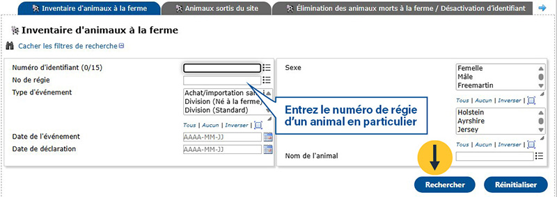Ensuite, définissez vos filtres. Par exemple, entrez le numéro de régie d’un animal en particulier dans le champ No de régie. Cliquez ensuite sur Rechercher.