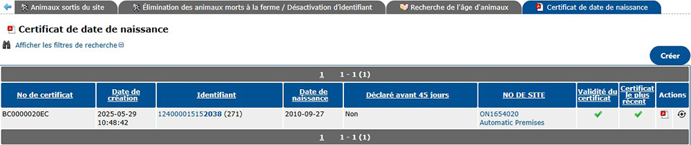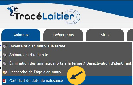 Ouvrez une session dans votre compte TracéLaitier. Dans l’onglet Animaux, cliquez sur Certificat de date de naissance.