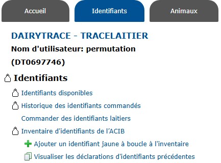 Tous les jeux de deux identifiants canadiens pour bovins laitiers peuvent être remplacés gratuitement (sauf pour les animaux nés au Québec). Vous pouvez commander le même numéro et poser le nouvel identifiant réémis à l’oreille de l’animal. Sept jours après l’expédition de l’identifiant, TracéLaitier déclarera automatiquement l’événement de Réémission, en présumant que le nouvel identifiant a été posé.