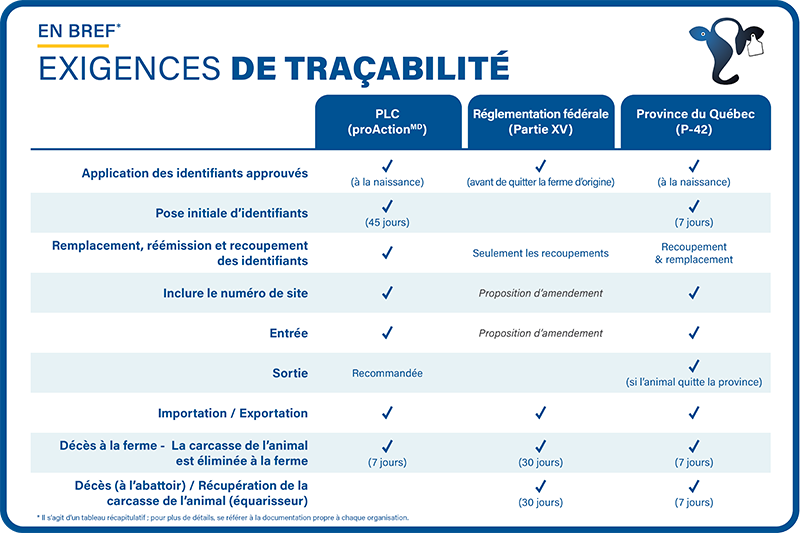 Le Règlement sur la santé des animaux et la Loi sur les produits alimentaires permettent de s’assurer que le parcours des produits laitiers destinés à l’alimentation humaine peut être reconstitué de l’assiette du consommateur jusqu’à la ferme d’origine. Cette réglementation, de même que proActionMD, établit les normes de traçabilité en lien avec l’identification des animaux, la pose des identifiants, les déplacements et les exigences.